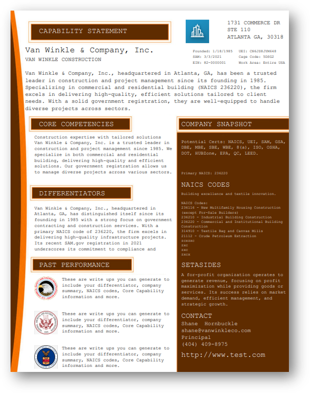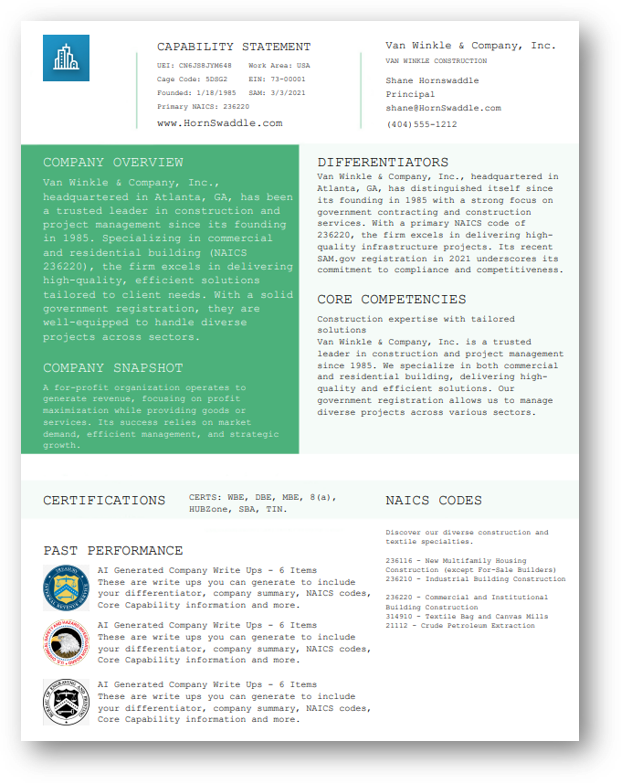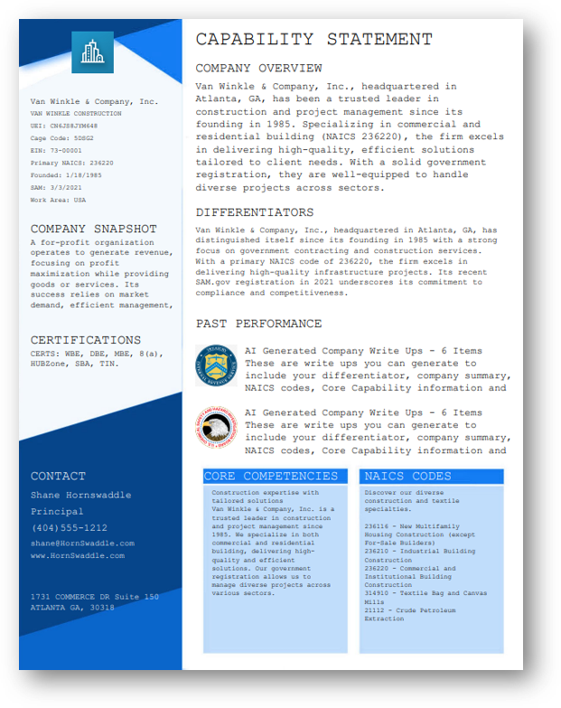 You can view and sample capability statements right on this page, each built using our AI-Driven templates.